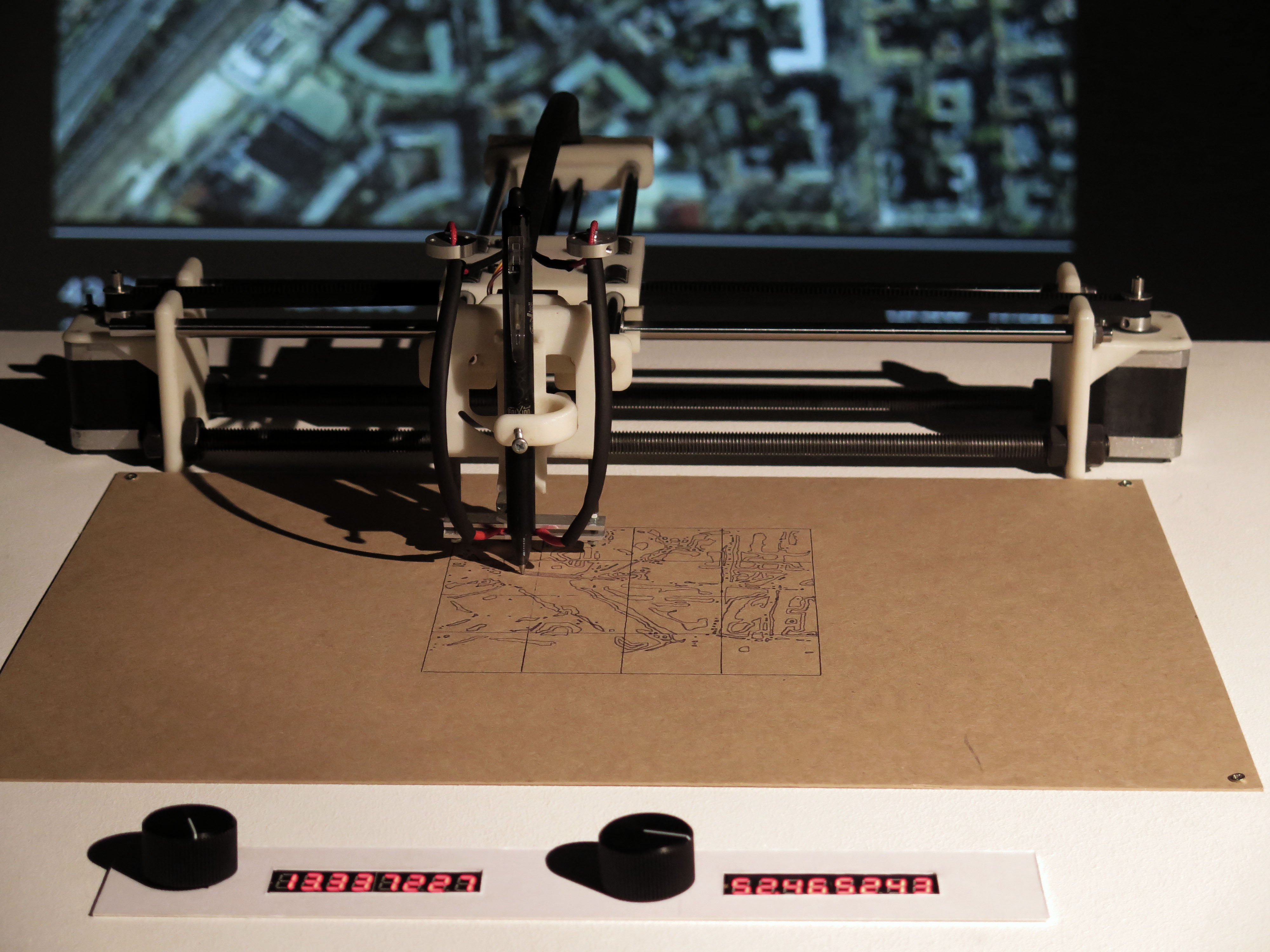 La instalación muestra una red neuronal que está basada en un circuito retroalimentado, donde conocimiento predefinido como «datos de entrenamiento» es empleado en el proceso de mapeo. Cada nuevo dato que se genera se escribe directamente como «dato de entrenamiento» de donde la red recoge información, lo que significa que cada decisión de la red está basada en una decisión que ya fue tomada antes. La máquina dibuja un mapa y genera una imagen de satélite a través de este, luego vuelve a crear un nuevo mapa del que se vuelve a generar otra imagen de satélite en un loop eterno. En este proceso se remarca el hecho de que estamos altamente centrados en los números y tendemos a verlos como objetivos, inequívocos y de libre interpretación. Al hacerlo, surge una ceguera frente a los procesos que generan los datos y la suposición de que los números hablan por sí mismos. No solo la colección de datos provee una visión interpretativa, sino que también los procesos computacionales permiten otras interpretaciones. Así, los números son vistos como el mundo en sí mismo, olvidando que los números solo representan un modelo del mundo. Este modelo, sin embargo, quiere decir que las personas adaptan su conocimiento a partir de las expectativas del modelo y se concentran en manejar los números adecuados.